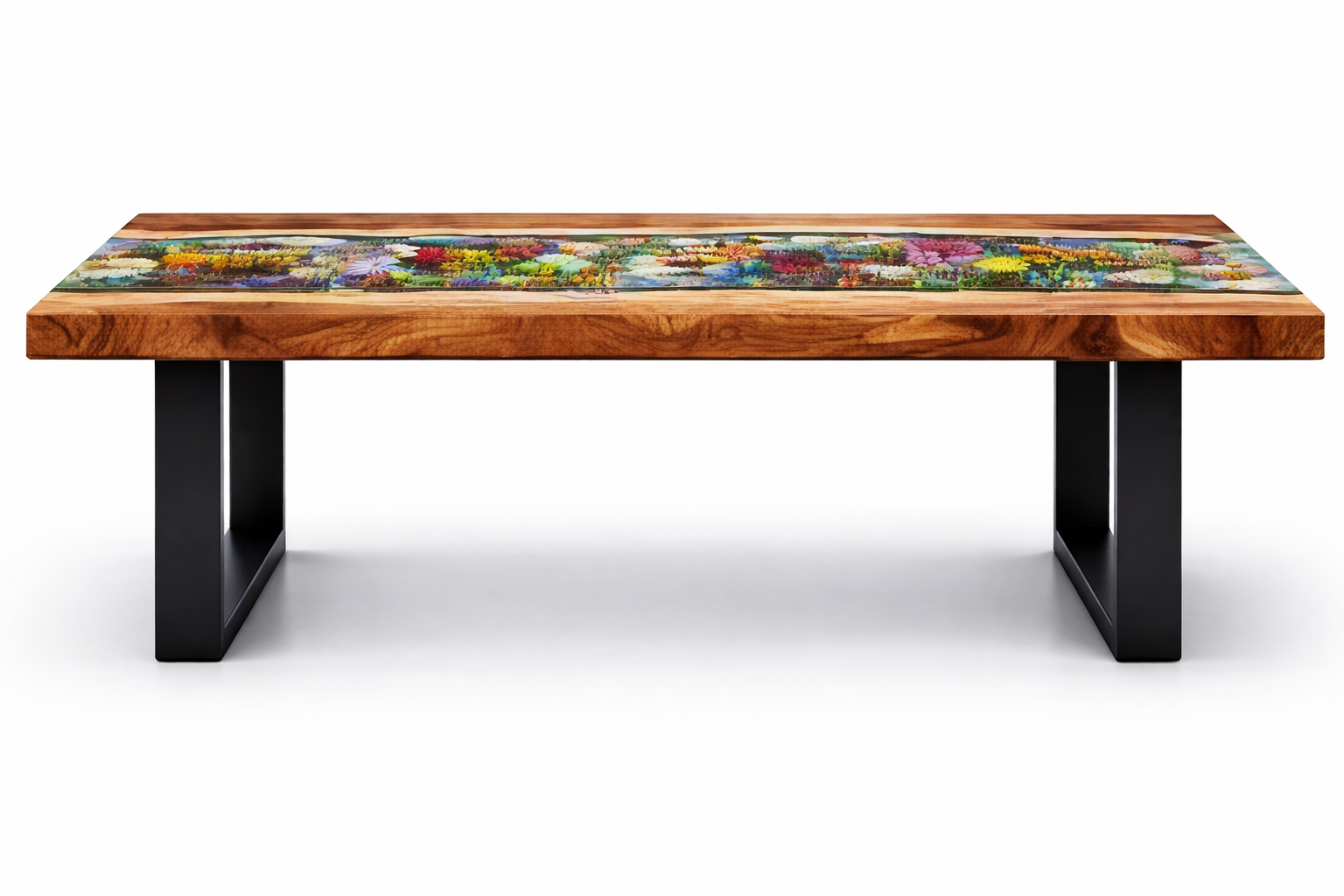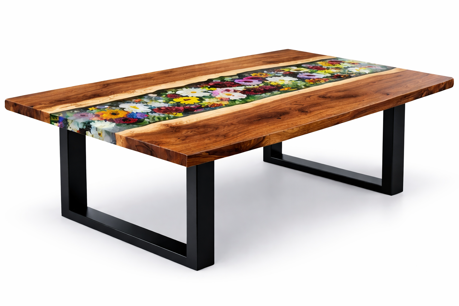 Each flower is carefully placed and encapsulated in professional-grade epoxy resin, resulting in a living-art effect that feels vibrant, detailed, and timeless. Balanced with strong matte black metal legs, the table delivers both visual drama and everyday durability.