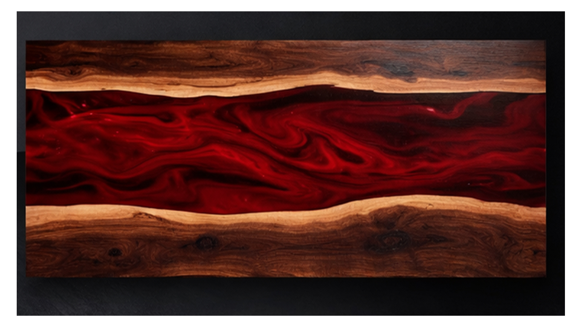 • Deep red epoxy resin river with flowing, layered patterns